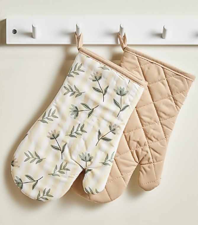Rękawice kuchenne "BLOOMY" to doskonałe połączenie funkcjonalności i pięknego, naturalnego wzornictwa. Delikatny kwiatowy motyw na jasnym tle tworzy spokojny, ciepły klimat, który odmieni każdą kuchnię. To idealne rozwiązanie dla osób poszukujących nie tylko praktycznego, ale również dekoracyjnego elementu wyposażenia. Sprawdzą się także jako elegancki prezent dla bliskich, którzy docenią ich wyjątkowy wygląd i solidne wykonanie.