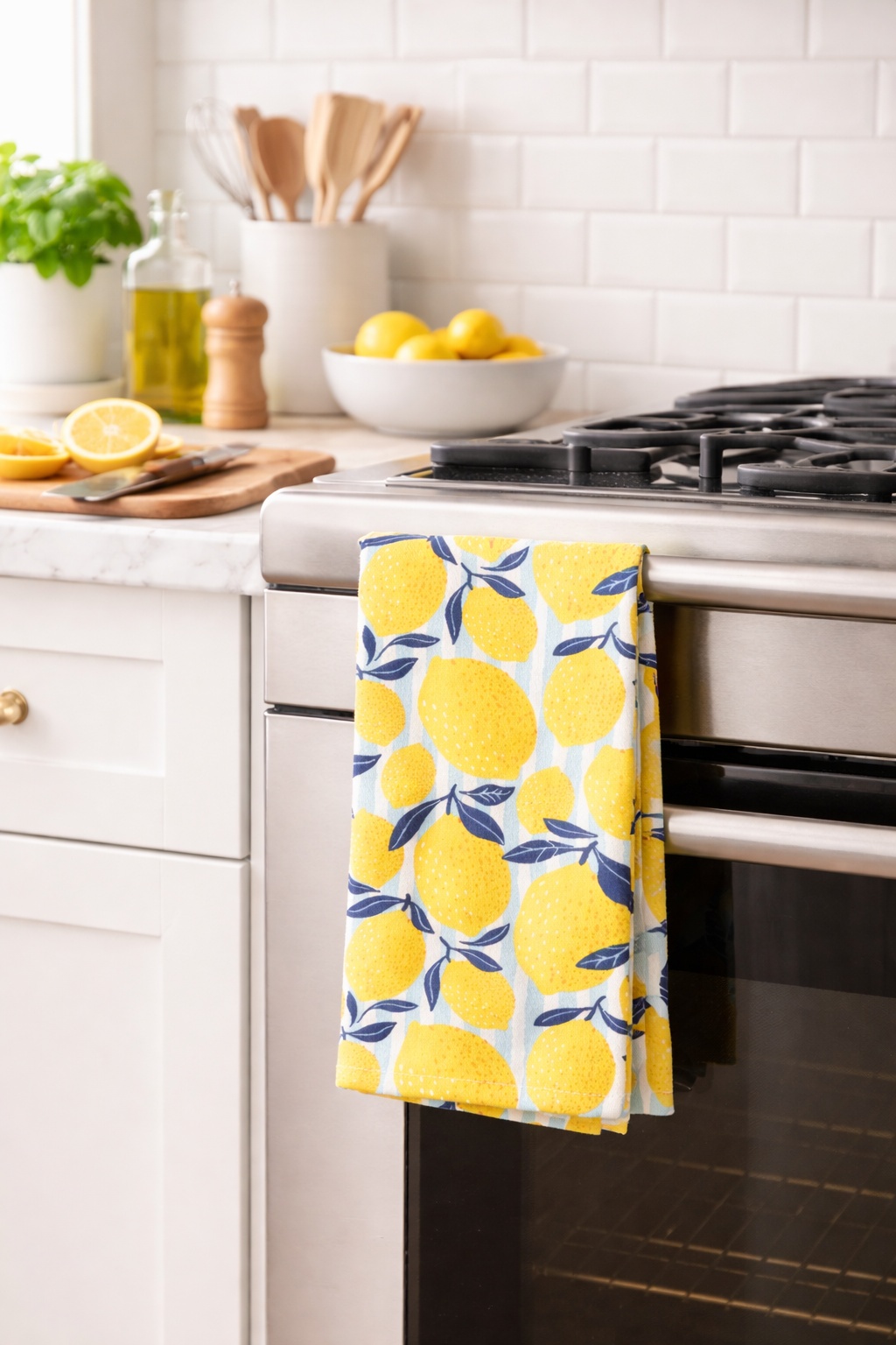 Poznaj ściereczkę kuchenną SUNSTRIPE – wyjątkowe połączenie świeżego, cytrusowego designu i codziennej funkcjonalności, które rozjaśni każdą kuchnię.