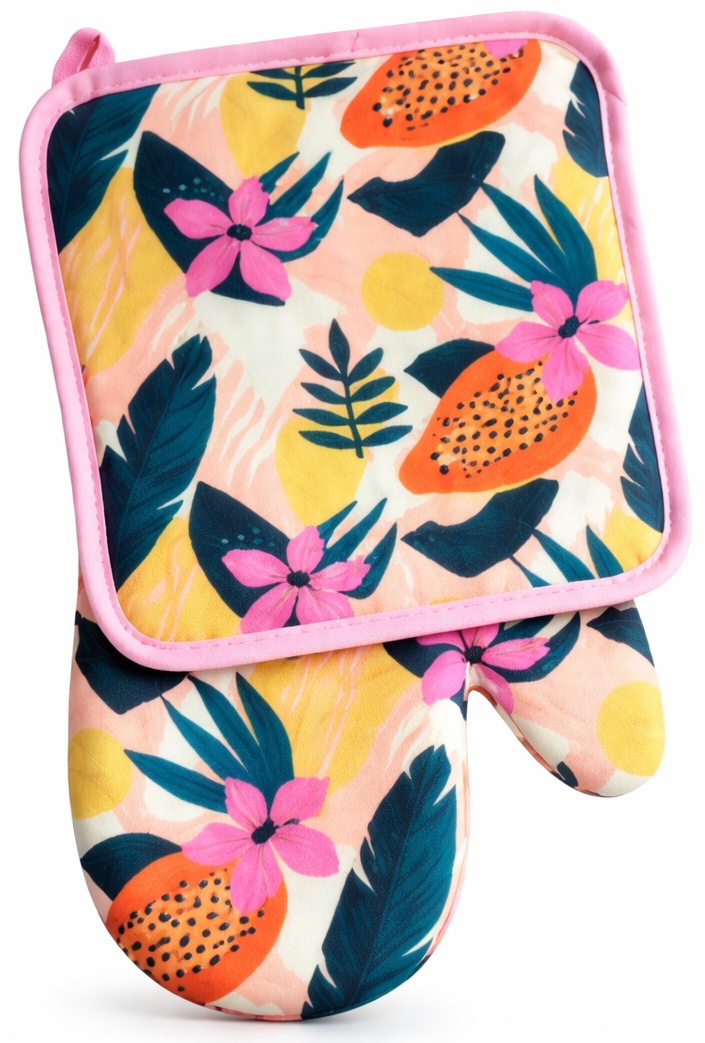Rękawica i łapka zapewniają bezpieczeństwo podczas kontaktu z gorącymi naczyniami, a ich wyjątkowy wzór sprawia, że codzienne gotowanie staje się przyjemniejsze.